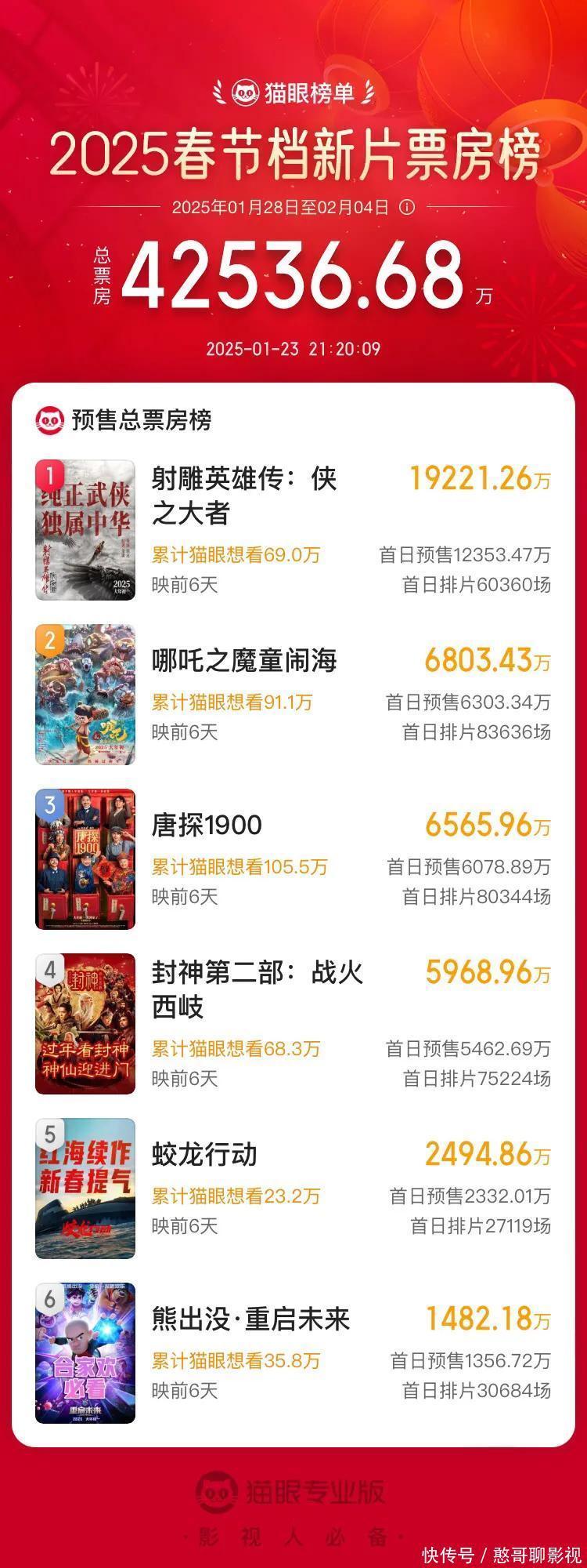 从预售情况来看,由徐克导演握导,肖战主演的古装武侠电影《射雕英雄传:侠之大者》发扬颠倒亮眼,预售票房照旧冲破1.82亿,紧随后来的是《哪吒之魔童闹海》和《唐探1900》《封神第二部战火西岐》票房也齐照旧冲破5000万,《蛟龙行为》票房2400万+,《熊出没:重启将来》票房1200万。