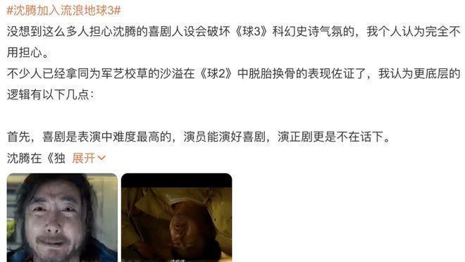 最近《流浪地球3》官宣开机,从2023年的第二部上映已矣就催的簿子也算是好了,这个IP关于艺东说念主来说险些是挤破头齐念念进去的,当然免不了会在新一部里加东说念主。在官宣音书发出的同期片方也官宣了沈腾加入的音书,话题也坐窝被奉上热搜激发烧议,有网友获胜吐槽沈腾不对适这部片子,把笑剧片里那套带入进去会显得。