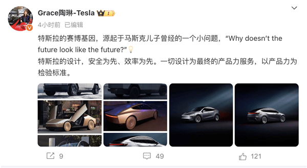 陶琳还共享了一个兴味兴味的故事,特斯拉私有的赛博格调设想灵感源自于马斯克女儿的一次发问:“为何异日并未如咱们所期待的那样展现?”这一疑问激励了特斯拉团队关于异日汽车设想的全新念念考。