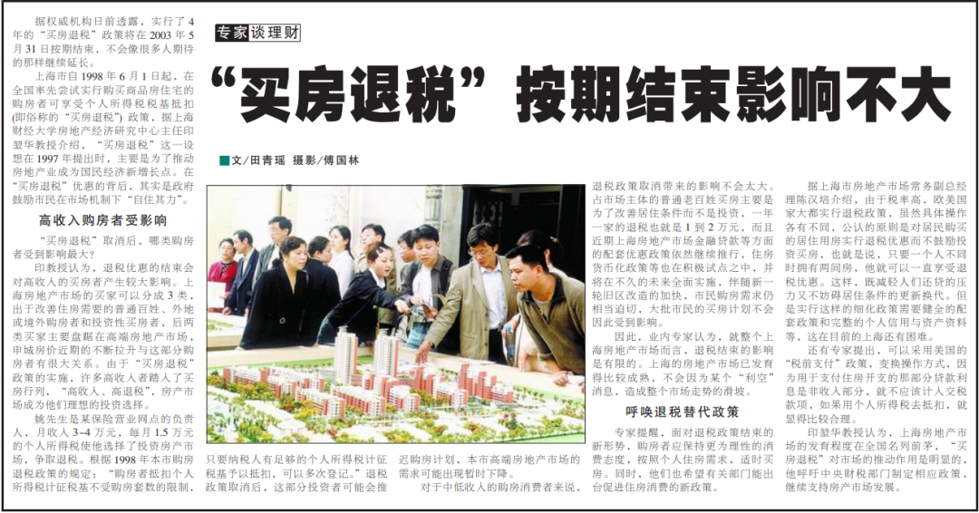 7、《申城临时性财政策略历时五年“买房退税”安详驱逐》,新民晚报,2003年6月3日;