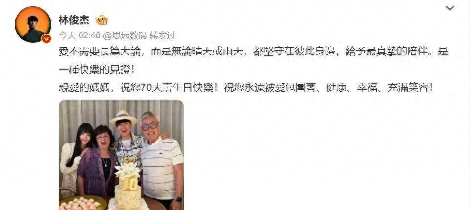 12月29日,林俊杰母亲七十大寿,他用一张家庭合影官宣了恋情。