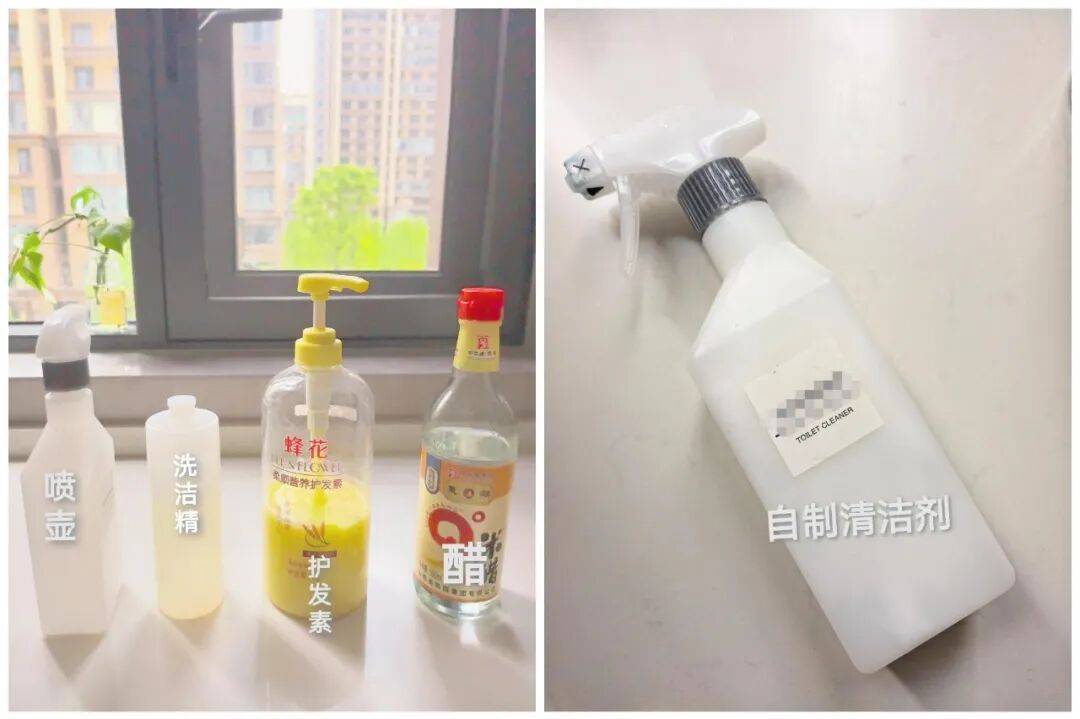 1)喷壶中加入洗洁精、护发素、白醋,并倒入温水摇匀,一瓶好处的清洁剂就作念好了。