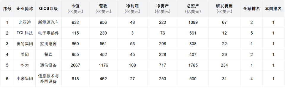 在咱们的全球产业数据库中,这6个公司齐是咱们概括评价的全球领军企业。华为是全球通讯开发产业冠军,好意思的是全球家用电器产业冠军,比亚迪是全球新能源汽车产业亚军,好意思团是餐饮产业亚军,小米是信息时刻与外围开发产业殿军,TCL主要产业电子零部件排行全球第五。