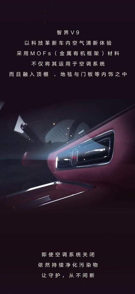 智界V9围绕该材料打造了一系列科技建立,UVC+MOFs杀菌滤芯、MOFs座舱内饰以及前后双负氧离子静态空气净化器等协同作用,有用甩掉新车异味,握久净化舱内无益物资,为用户构建起迁移的安全堡垒。