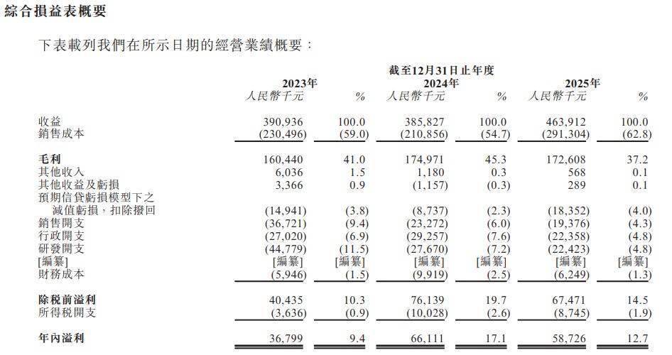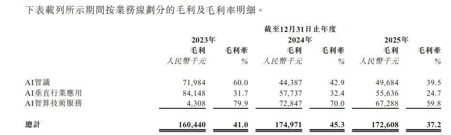 凭借公司的中枢AI期间、对哄骗领域的深入连结以及求实且高效的交易化智商,公司已于往绩期间已毕无间盈利。扫尾2023年、2024年及2025年12月31日止年度,公司的年内溢利折柳为东说念主民币3680万/span>扫尾2023年、2024年及2025年12月31日止年度,公司的年度经休养纯利(非国外财务报告准则计量打算)折柳为东说念主民币3680万元、东说念主民币6610万元及东说念主民币7600万元。2023年、2024年、2025年,公司毛利折柳为1.6亿、1.75亿元、1.73亿元;毛利率折柳为41%、45.3%、37.2%。
