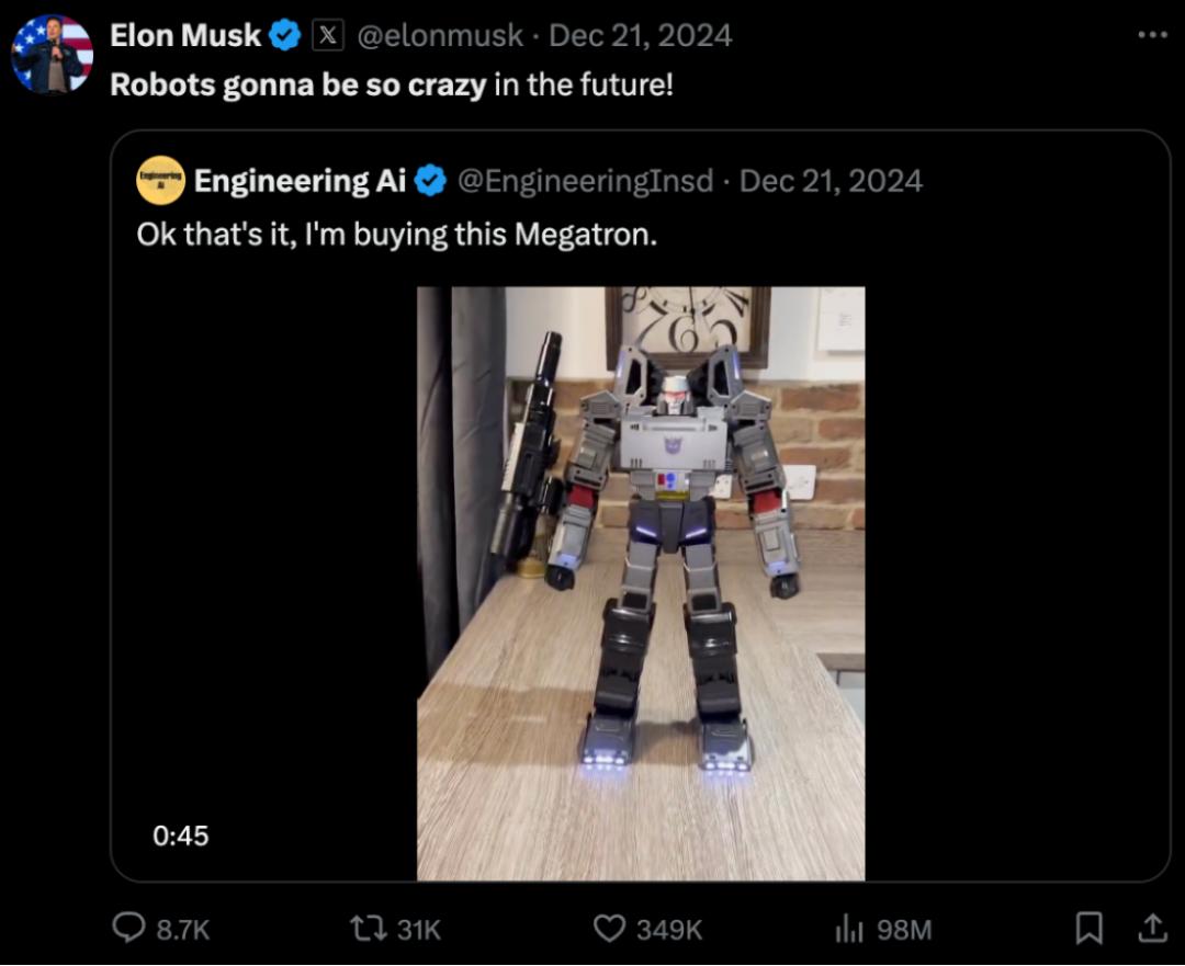 这让好多东谈主看到了AI玩物的诱导力。之后,马斯克在酬酢媒体上点赞了一款中国的AI玩物,能够随着主东谈主的“变身”蜿蜒腾挪,最终变身成威震天。