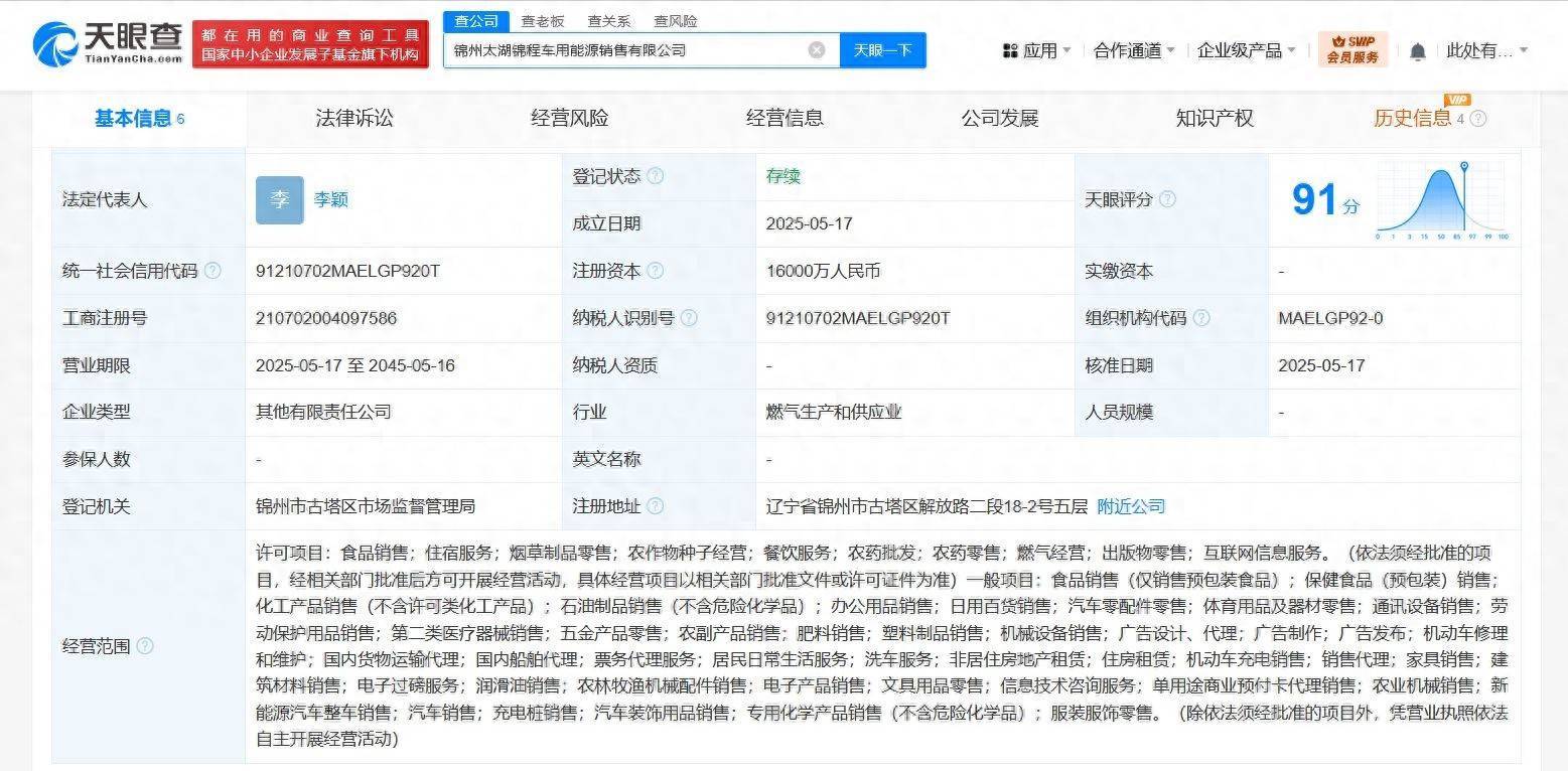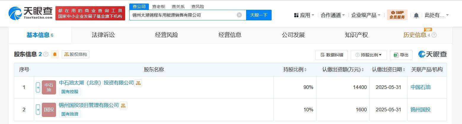 天眼查App知道,近日,锦州太湖锦程车用动力销售有限公司树立,法定代表东谈主为李颖,注册本钱1.6亿东谈主民币,策动界限含食物销售、住宿服务、香烟成品零卖、汽车零配件零卖、体育用品及器材零卖、通信开辟销售、工作保护用品销售、第二类医疗器械销售等。鼓吹信息知道,该公司由中国石油(601857)旗下中石油太湖(北京)投资有限公司以及锦州国投情势管制有限公司辩认捏股90%、10%。