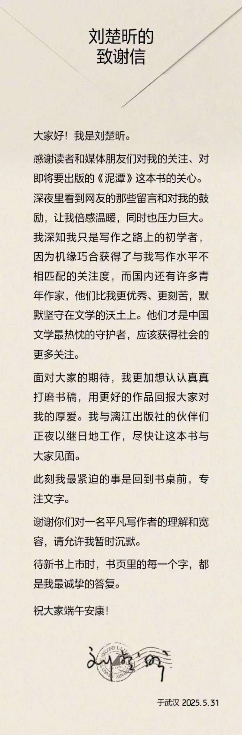 在5月31日发表的致谢信中,刘楚昕对宇宙的关怀和荧惑暗示感谢:“面临宇宙的期待,我愈加思认认真真打磨书稿,用更好的作品陈诉宇宙对我的认真。”刘楚昕还在信中称,“此刻我最垂死的事是回到书桌前,专注笔墨。谢谢你们对又名粗俗写稿者的剖析和宽宏,请允许我暂时千里默。”