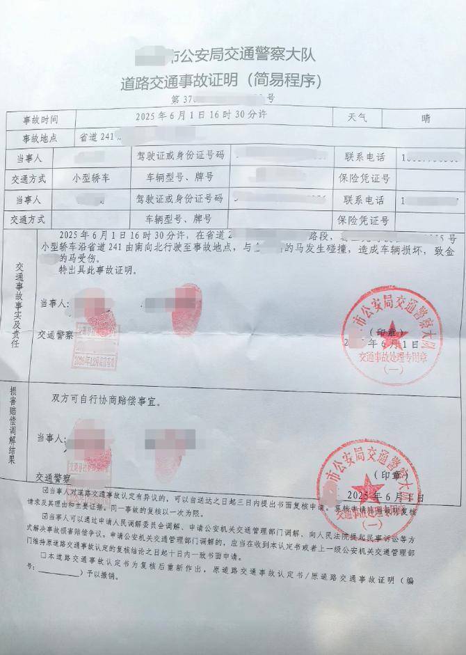 车主贴出交警出具的谈路交通事故施展,阐明车与马发生碰撞,车受损,马受伤,需两边协商抵偿事宜。