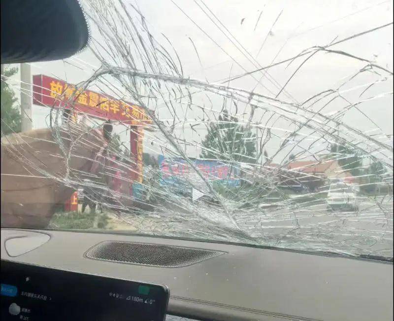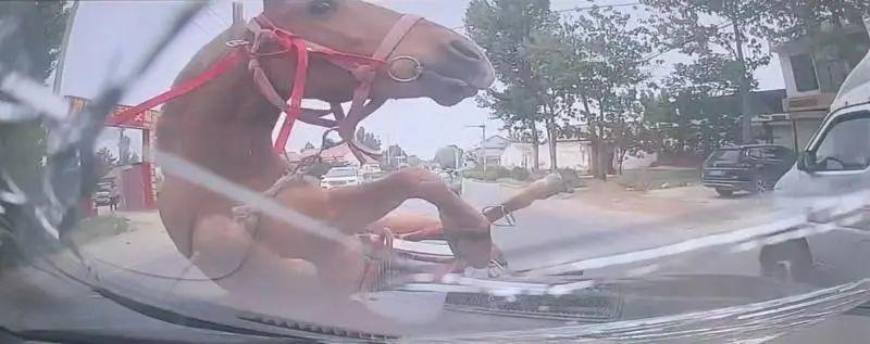 疑似行车记载仪视频显现,6月1日16:31:41,其驾车路过这个交往市集时,一匹马快速奔向前,撞在车头,右前挡风玻璃突破,摧毁处还残留有血印。