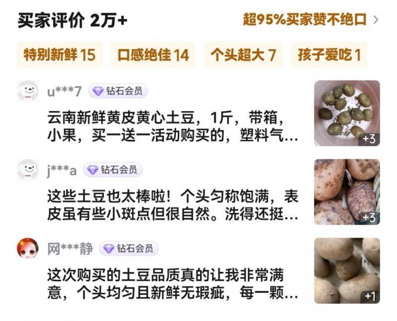 在京东APP“京喜自营官方店”的商品细则页中,土豆单价仅几元钱,好评率达到95%,超2万条评价中频出“极度簇新”“口感绝佳”“个头超大”等要道词。