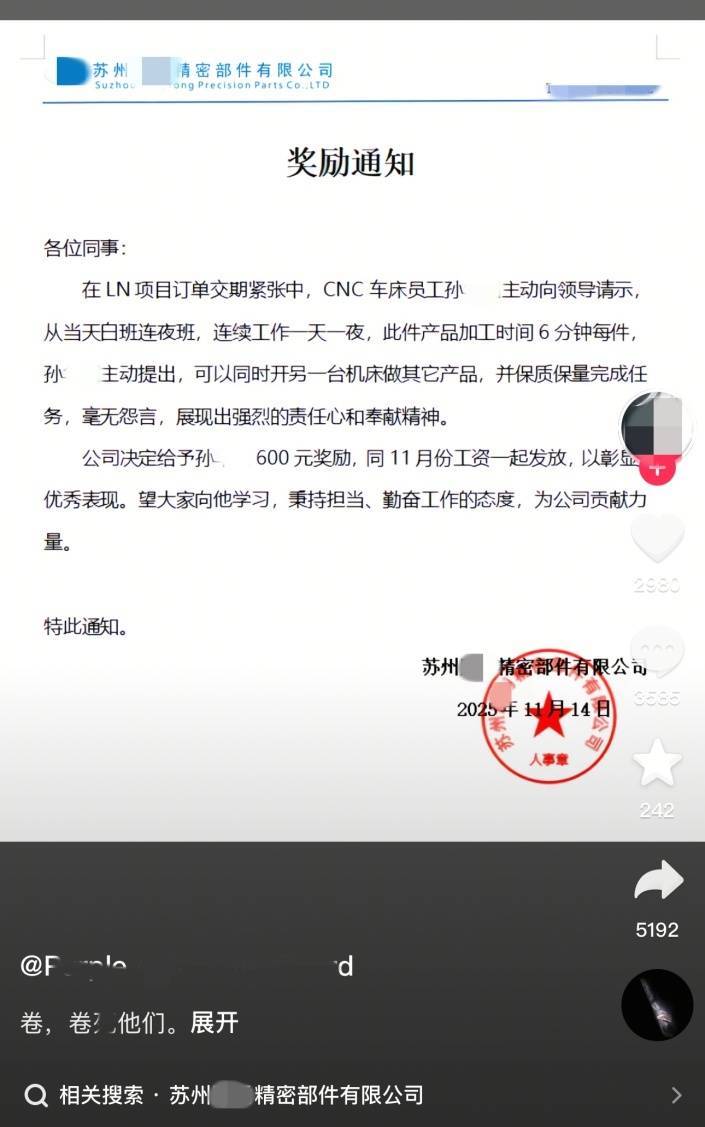 嘱咐平台流传的《奖励示知》披露,在“LN样式订单交期弥留”时间,CNC车床职工孙某“主动向领导呈报,从今日白班连夜班,相连责任一天今夜”。文中提到,此件产物加工时间6分钟每件,孙某主动提倡,不错同期开另一台机床作念其它产物,并保质保量完成任务,毫无怨言,展现出浓烈的连累心和奉献精神。