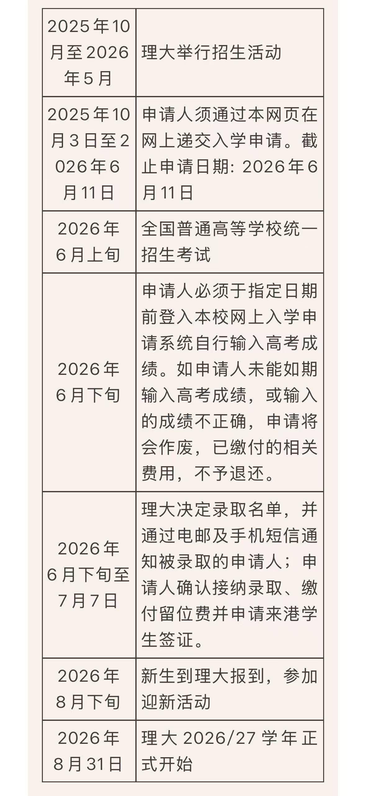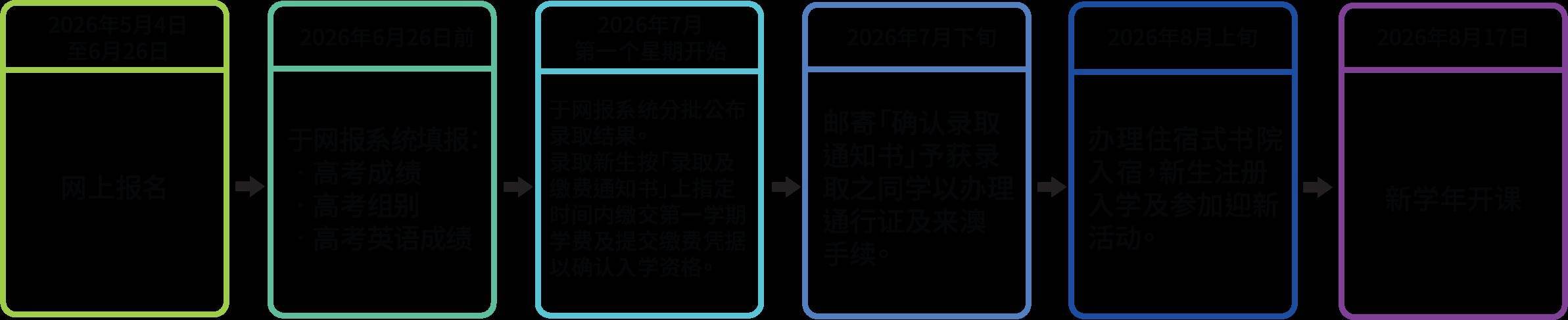 rr弃取报考志愿:了解学校所提供的本科课程及肯求志愿选项。r建设网上账户:通过香港科技大学网上肯求系统建设肯求账户,残酷使用电脑端填写。r填写肯求表:登入肯求账户填写个东说念主府上及高考府上等,上传补充文献。r递交肯求:通过网上肯求系统缴交肯求及评审费,以说明递交肯求。在肯求阶段,除肯求费外,肯求东说念主不需要缴交其他用度。r提交高考号:须在2026年6月10日前通过网上肯求系统提交高考号。r填报高考收获:2026年6月下旬高考收获发布后,需在第一手艺通过网上肯求系统填报高考收获。r口试:合伙历肯求东说念主将获邀参加六月底的口试,口试确定将于网上肯求系统公布。r收用及奖学金效能:收用效能将于口试终了后至2026年7月上旬公布,入学奖学金效能将络续发出。rr