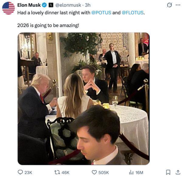 据群众网音书开云体育,宇宙首富埃隆·马斯克当地时代1月4日在酬酢平台X上发文称,他于3日晚与好意思国总统特朗普和好意思国第一夫东谈主梅拉尼娅·特朗普“共进好意思好晚餐”,并配上一张三东谈主一皆用餐的像片。